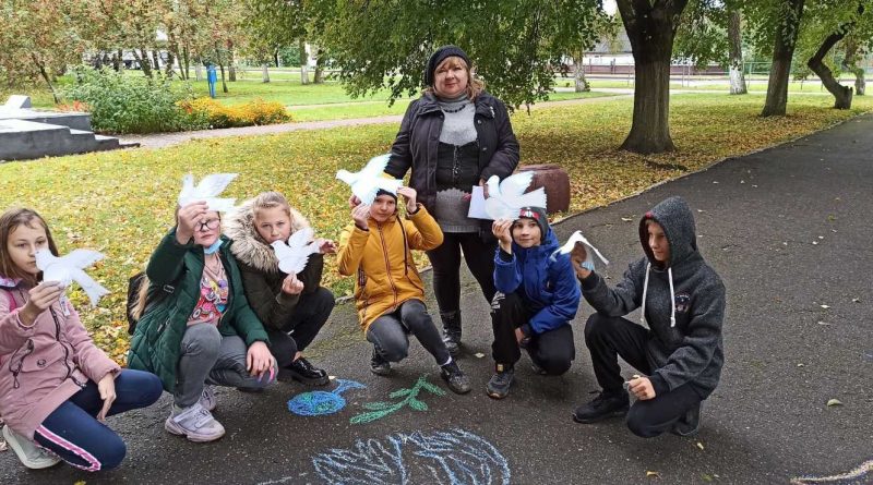 Красненский СДК провел совместное мероприятие с Красненской школой. Мастер — класс «Символ мира», рисунок на асфальте «Я рисую мир».